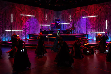 The witch's magical staff from UW-Madison's University Theatre & University Opera production of Into the Woods (Feburary 2019). The orb at the top of the staff contains LED diodes suspended in resin, which the actor can turn on and off, and can switch light color from pink to green. Staff design, construction, and electronics by Lydia Berggruen (Props Master), paint by Grace McGuire (undergraduate student), production photos by Beau Meyer. Materials: PVC pipe, clear plastic ornament, multicolored LED diodes, 9V battery, clear acrylic resin, holographic cellophane shreds, eco-mastic, craft paper, muslin, yarn, low temp hot glue, acrylic paints